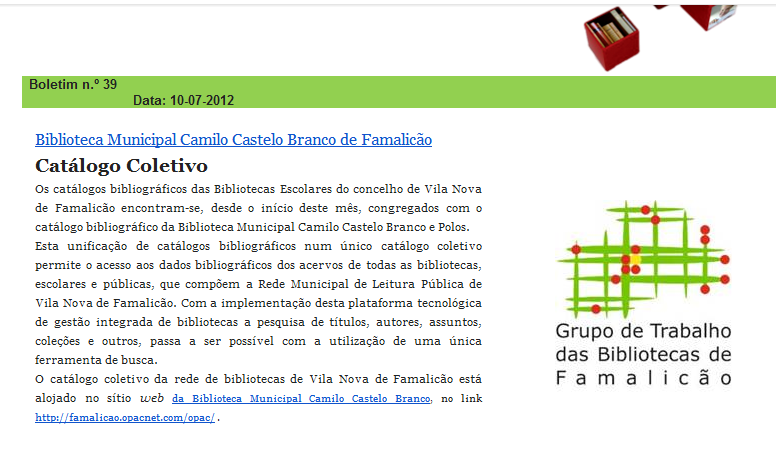Na próxima sexta-feira, dia 5 de outubro, arrancam em Vila Nova de Famalicão as comemorações do centenário da Biblioteca Municipal Camilo Castelo Branco. Ao longo de um ano, até 5 de outubro de 2013, a Biblioteca celebra 100 anos de existência com um programa cultural repleto de atividades. O presidente da Câmara Municipal de Famalicão, Armindo Costa, abre as comemorações numa cerimónia que inicia pelas 10h30. Segue-se a inauguração da exposição documental “100 anos: a História de uma Biblioteca”. E a estreia do espetáculo “O Segredo da Caixa”, pela Fértil - Associação Cultural. Refira-se que a Biblioteca Municipal foi inaugurada a 5 de outubro de 1913, pelo Senador Sousa Fernandes, aliando-se as comemorações ao terceiro ano da implantação da República, num gesto simbólico que ligava a cultura à revolução.